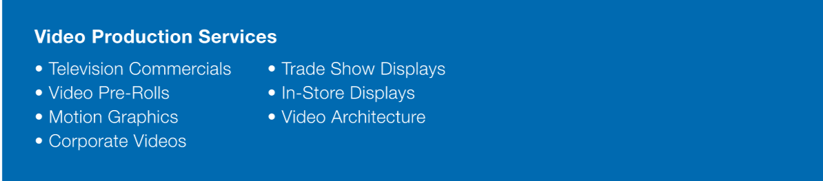 Our roots are in film and video production. Our business was built on it. And now, video is driving everything, from trade show displays to TV spots to in-venue to pre-rolls on YouTube. We even use video to create architectural features.